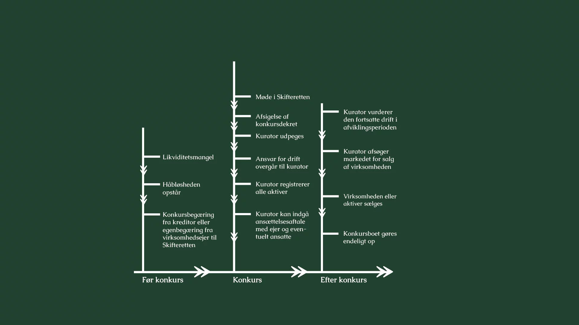 Vi har her illustreret, hvordan konkursprocessen for et landbrug typisk forløber. Jo mere du og din familie ved på forhånd, jo bedre kan I sammen forberede jer på det, der skal ske.